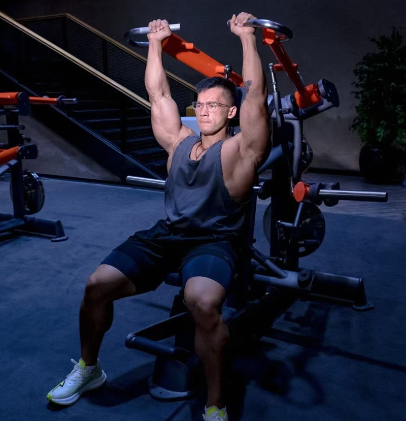 Starting position: Sit on the fixed seat of the back-stretching machine and hold the crossbar with a wide grip. Keep your chest out and shoulders down, and lean your body slightly backward.